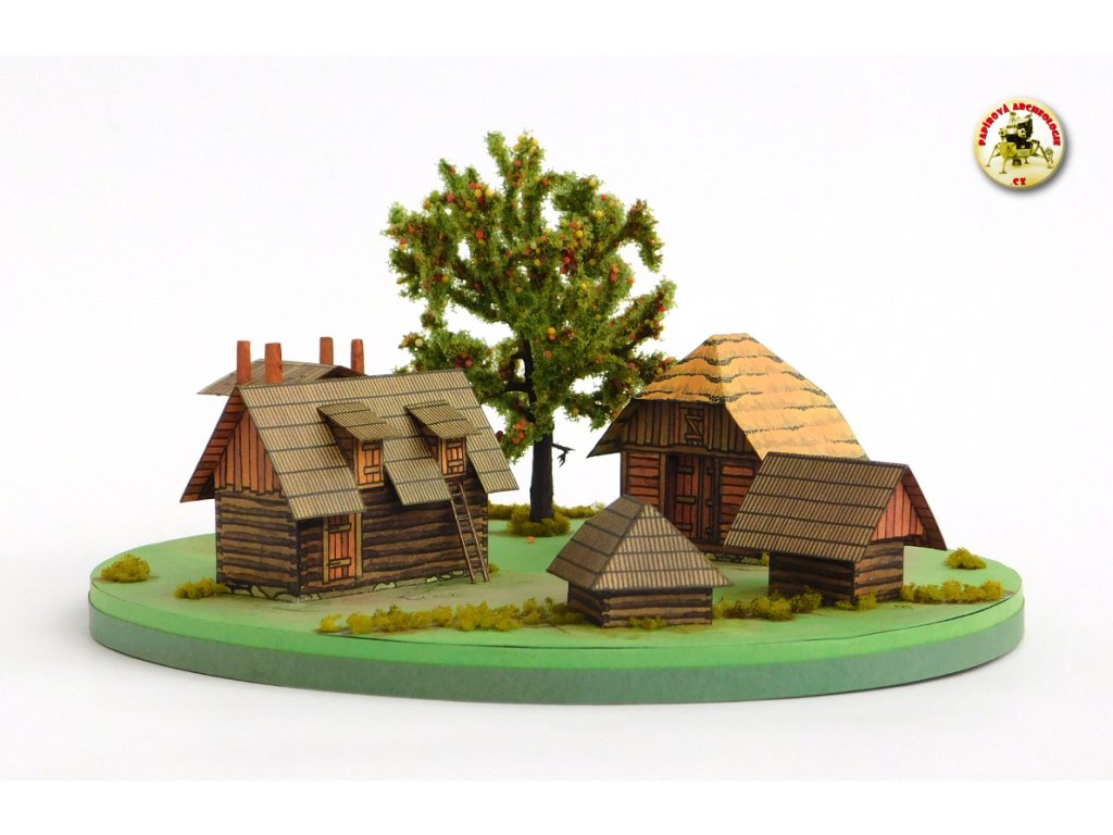 Papírový model / vystřihovánka - Doplňky kolejiště 2 - Roubený seník, oboroh, haltýře a seník s doškovou střechou